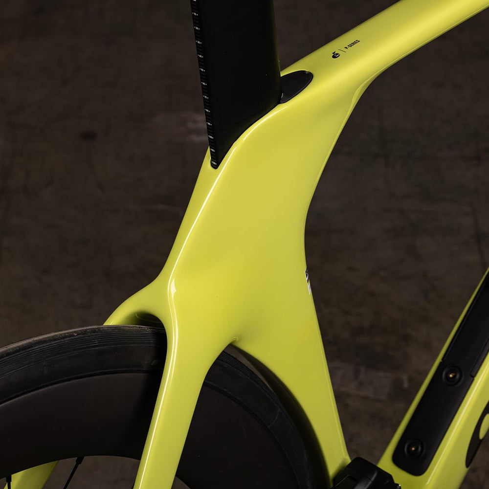 FREE SPEED: The new P-Series frame is 5.9 grams faster than the outgoing one, but the added tire clearance makes room for the Reserve 52/63 wheels, and 29mm Vittoria tires, which combine for a 30 grams or 3.5 watts savings vs the Reserve 50/Vittoria 28 combo.