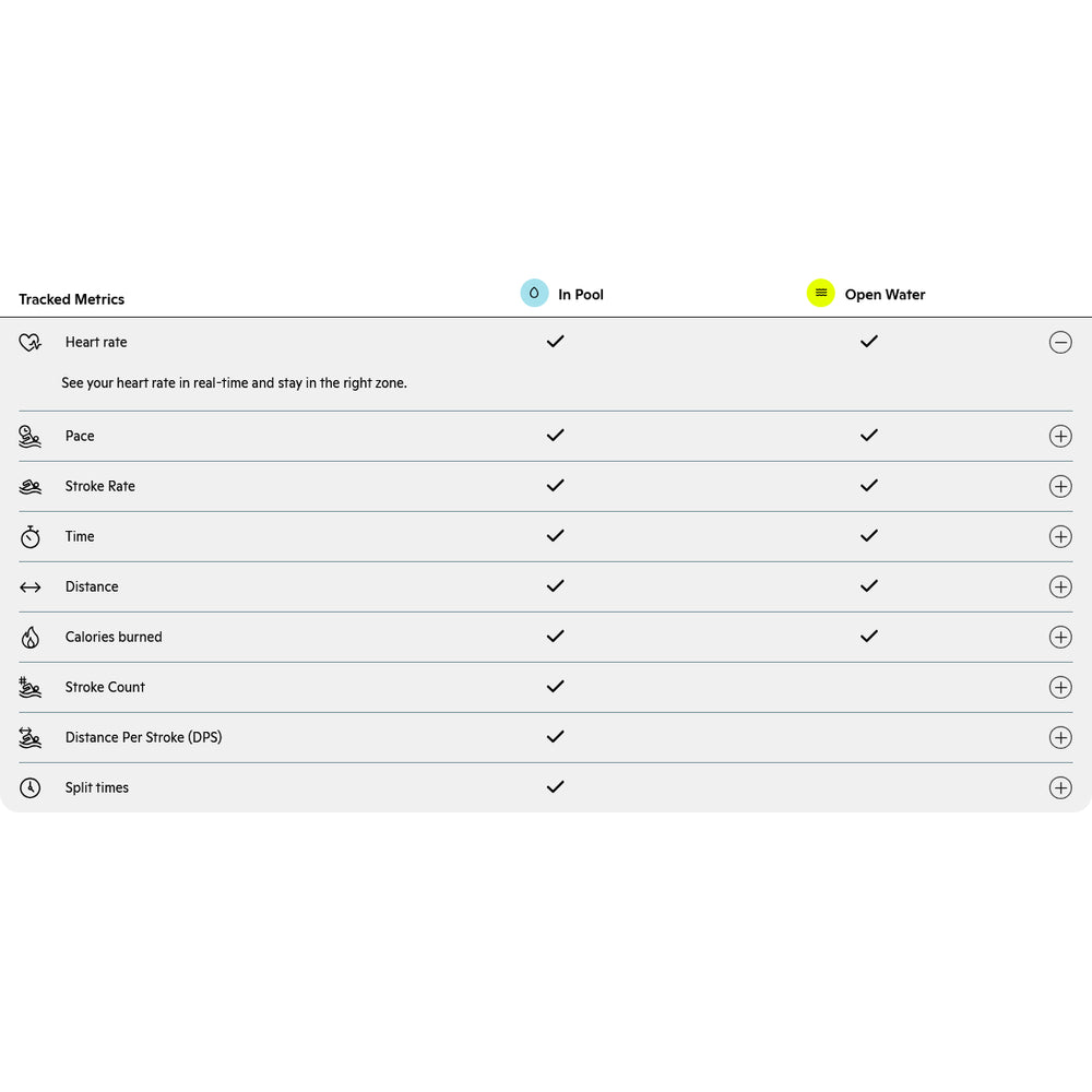 - Open Water Swim Tracking: Captures heart rate, stroke rate, and time using onboard sensors, plus GPS-powered distance and pace when paired with Garmin or Apple watches