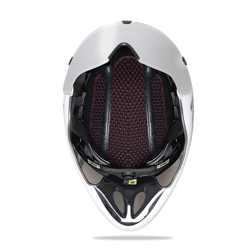 The high performing shell is incredibly aerodynamic in all head positions. Ventilation is ensured by the presence of six micro air intakes on the front and four exhaust vents in the rear, connected via an internal air duct system. The visor is integrated with the helmet using a magnetic system. The visor can easily be removed and replaced while riding. It is available to accessorise with team kits in three colourways: silver, mirror, clear.