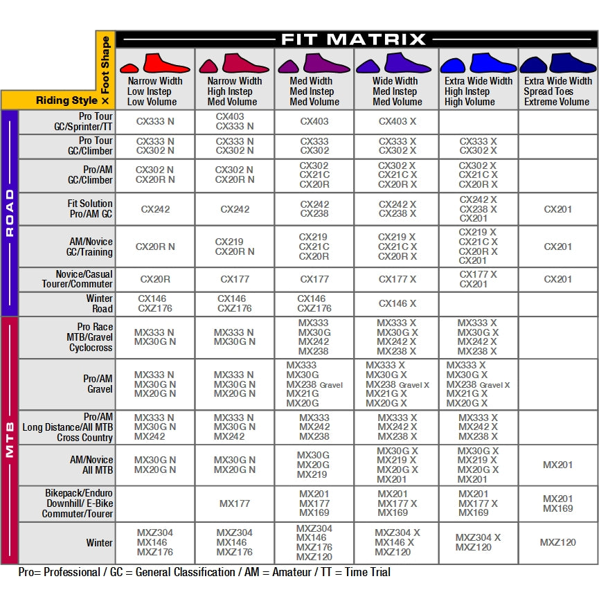 - CX RACE Last: With a slightly narrower toe box and heel area than the Competition last and less overall volume than the Sport last. Designed for very high cadence riding and a slimmer fit.