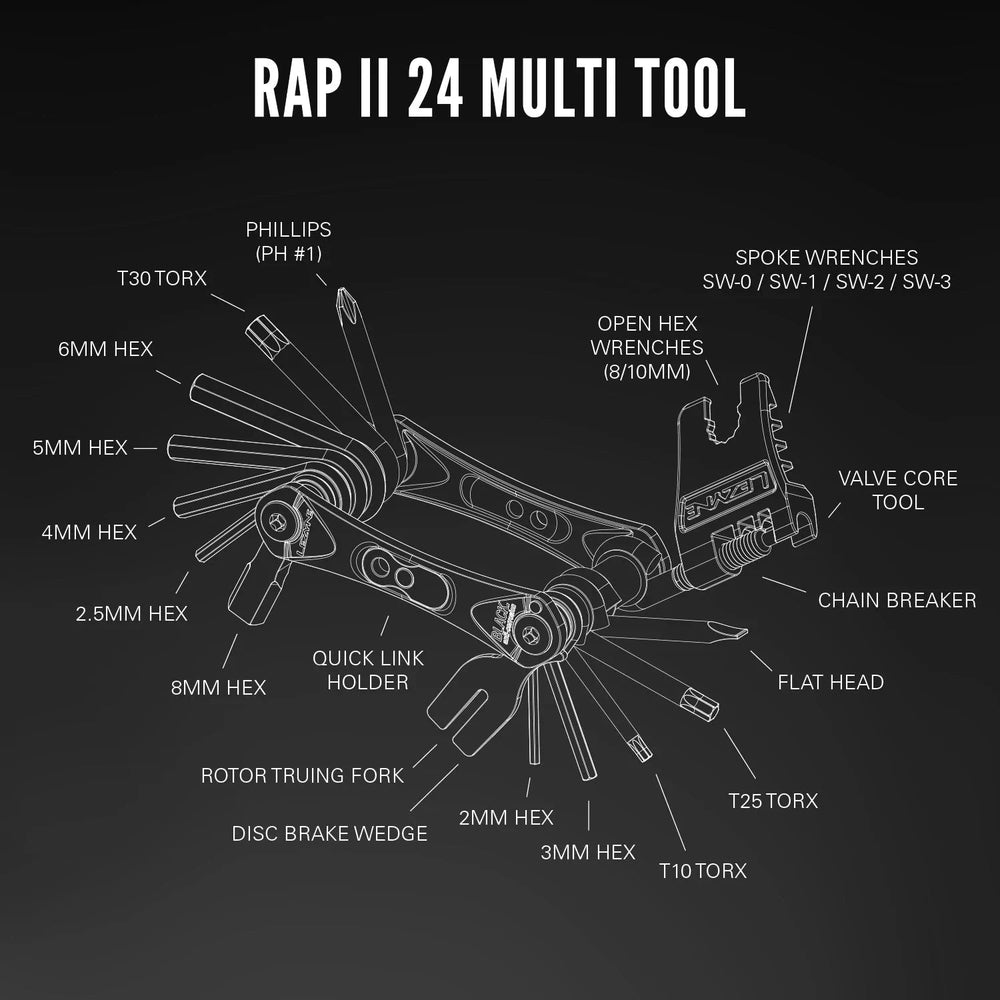 RAP II 24: QUICK LINK HOLDER, HEX 2/2.5/3/4/5/6/8mm, TORX T10/T25/T30, PHILLIPS, FLATHEAD, CHAIN BREAKER, 8/10MM WRENCH, 4 SPOKE WRENCHES, DISC BRAKE WEDGE, ROTOR TRUING TOOL