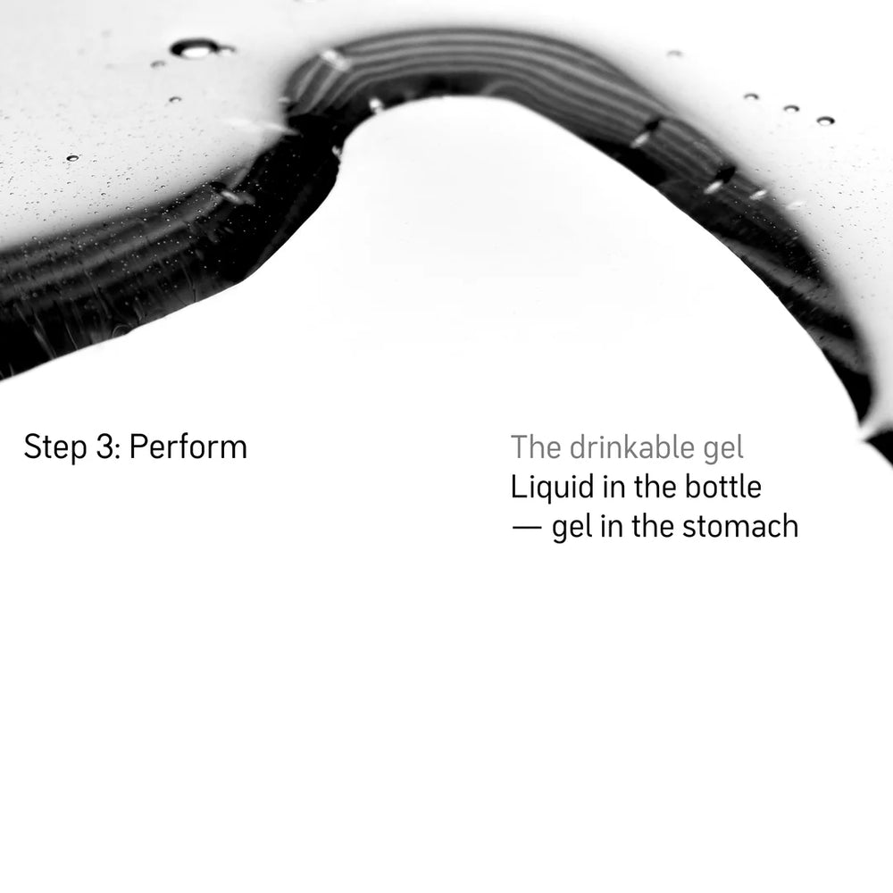 Drink Mix is a pH-sensitive liquid when mixed with 500 ml of water. When it meets the acidic environment of the stomach, an instant reaction occurs that converts the liquid into a hydrogel. The hydrogel encapsulates the carbohydrates, enabling the transportation of fuel through the stomach. Once in the intestines, the hydrogel dissolves and the carbohydrates are released and absorbed.