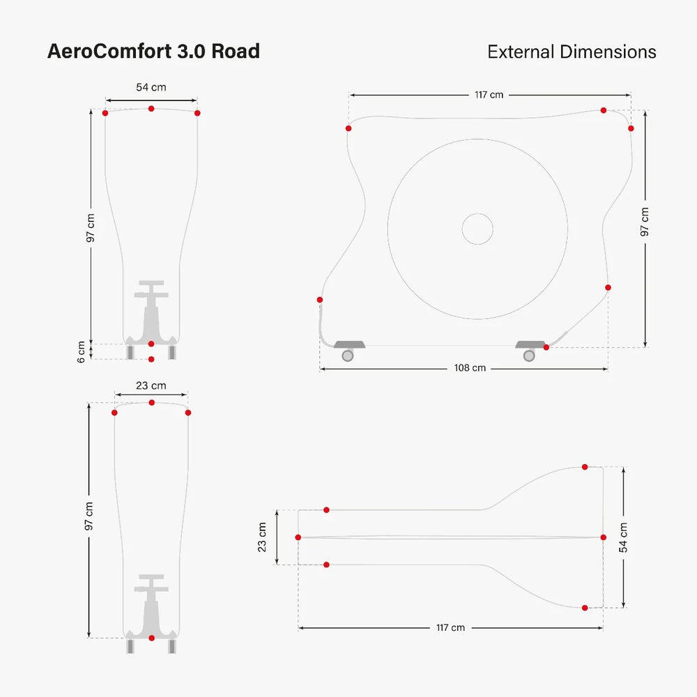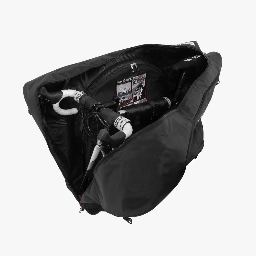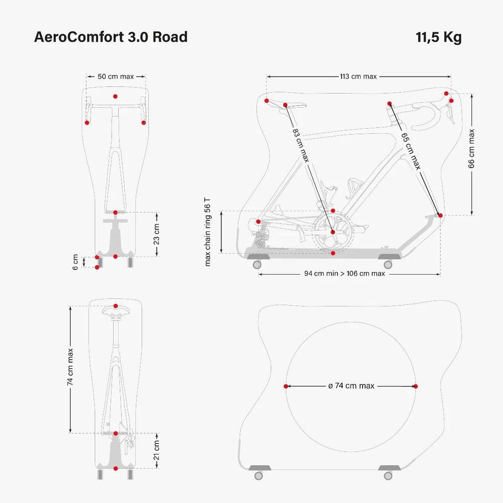 Aerocomfort 3.0 represents the optimal solution for transporting road bikes by airplane without the need for disassembling handlebars, saddle, seatpost. This ensures that no bike fitting measurements are lost. The exterior contours perfectly match the bike frame, minimizing bulk. Crafted from 3D-Padding™ a padded triple-layer tear-resistant fabric, TwistZip™ Double Coil zipper. Internally, a built-in kickstand stabilizes the bike, preventing unwanted movement during transport, alongside two integrated wheel pockets. Endorsed by hundreds of pro-riders, it has proven its reliability through more than 35.000 flights per year—becoming an icon for bicycle travelers.