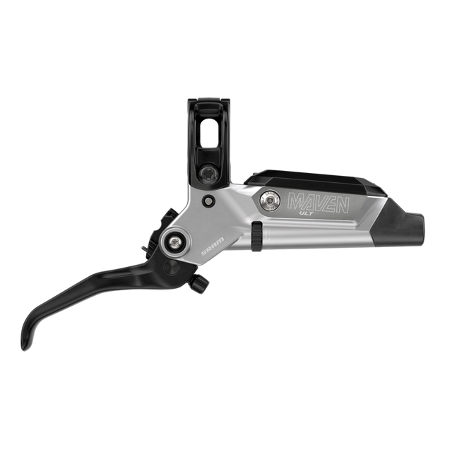 Modern mountain bikes have redefined what riders are capable of, pushing the requirements for heavy-duty power further than ever before. Maven Ultimate is our answer to that evolution, with monstrous 18 and 19.5-millimeter pistons driving 50% more power than Code. But best-in-class power means nothing unless you’re able to harness it. Swinglink translates rider input for progressive power throughout the lever pull, maintaining SRAM’s signature ride feel. And because of a stiff 4-bolt caliper that sheds an incredible amount of heat, that feel remains consistent, so the last corner feels like the first corner. But with so much baseline power on hand, there is more range than ever before to tune the ride qualities to exactly how you want with different pad materials, and rotor sizes. Maven Ultimate pairs a sleek high polish lever body to a caliper with machined edges and titanium hardware for a finish worthy of any modern super bike. And for unrivaled ease of customization, features tool-free Reach and Contact Point Adjust. Maven is the expert, but Maven Ultimate is the pinnacle.