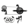 - Aftermarket groupset includes rear derailleur, front derailleur, shift-brake controls, chain, disc brake calipers, rotors, battery charger, and Hammerhead Karoo