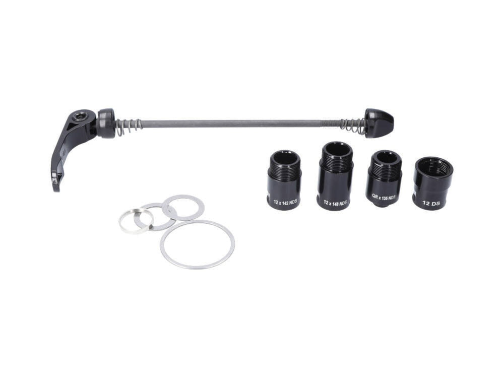 Assembly parts for NEO 2T. Kit Includes: QR skewer, axle end caps (12mm DS, 12x142 NDS, 12x148 NDS, 135 QR NDS), cassette body spacers (.5mm and 1mm), 10-speed cassette body spacer and 2.7mm disc brake spacer.