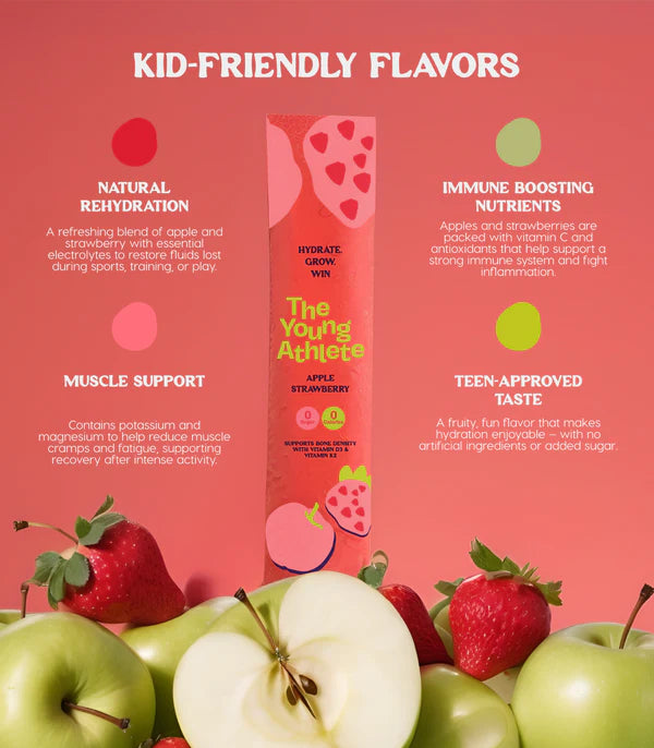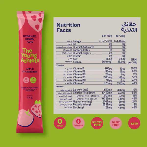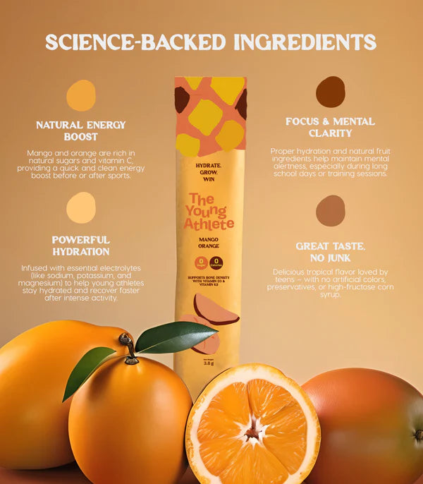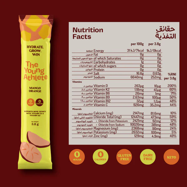 - What We Offer: Our electrolyte drink mixes are made with: Balanced hydration for growing athletes(252 mg of sodium), friendly flavors like Mango Orange, Raspberry Lemonade, and Apple Strawberry; No added sugar, Keto and no artificial junk; Electrolytes that support real performance and recovery; Packed with Vitamin K and Vitamin D to support bone density and growth; The Young Athlete Hydration Drink combines electrolytes for hydration with Vitamin D3 and K2 to support bone growth and density. Whether it’s practice after school, a weekend tournament, or just an active day with friends, The Young Athlete Hydration Drink helps teens and young adults stay at their best.