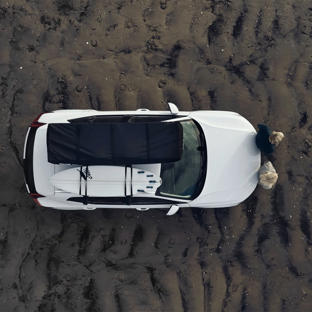 When folded, the Thule Foothill car top tent has a width of just 61 cm, half the size of most rooftop tents on the market. Despite its compact travel size, the deployed tent has just as much interior space as a traditional 2-person tent. To set it up, simply unfold the tent and deploy the telescoping poles. When folded, the tent’s low profile design sits just 24 cm above the roof rack. This creates a more aerodynamic profile and ensures the tent takes up less storage space in a garage in the off season.