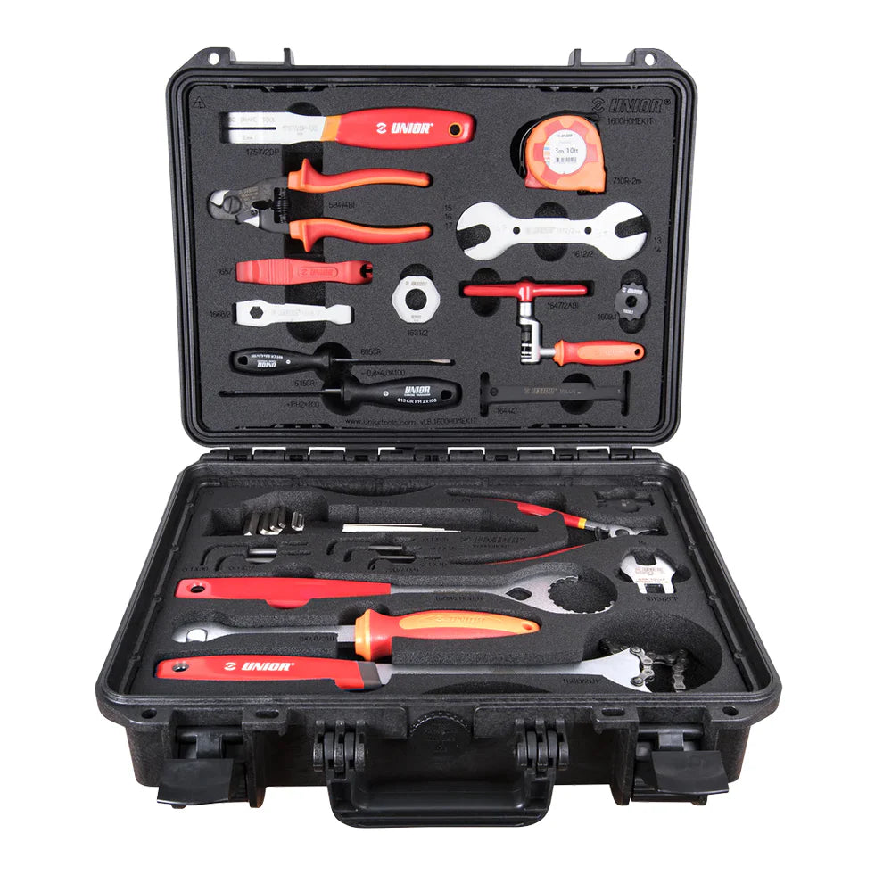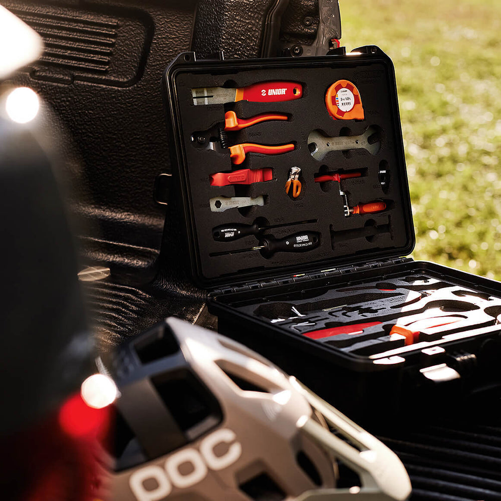 With 34 carefully selected Unior tools of the highest quality, much more than just basic maintenance work can be carried out on almost any bike. All tools are organized in foam inserts with corresponding cut-outs. The case is dust and waterproof, so the tools are always well stored. An additional foam insert can be adapted for new contents. It can be cut to fit your favorite tool or removed to create more space.